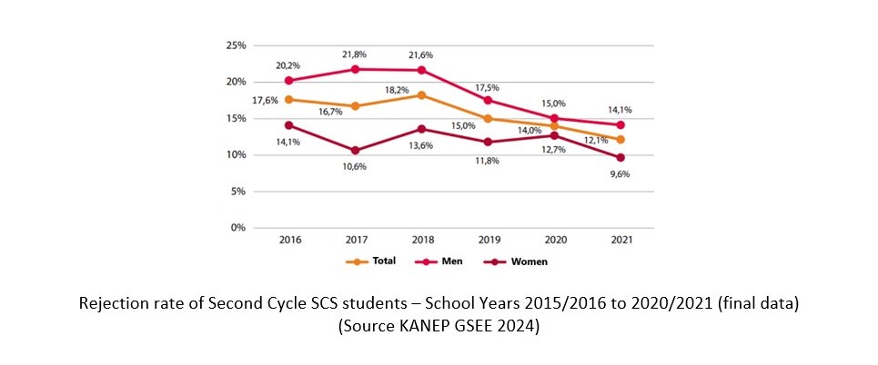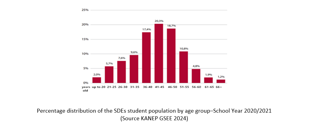 A 2021 study, published in 2024 by the Centre for the Development of Educational Policy (KANEP-GSEE) examined the landscape of SDEs, which provide flexible education services for school-leaving adults seeking to obtain certificates equivalent to lower-secondary education (Gymnasio).