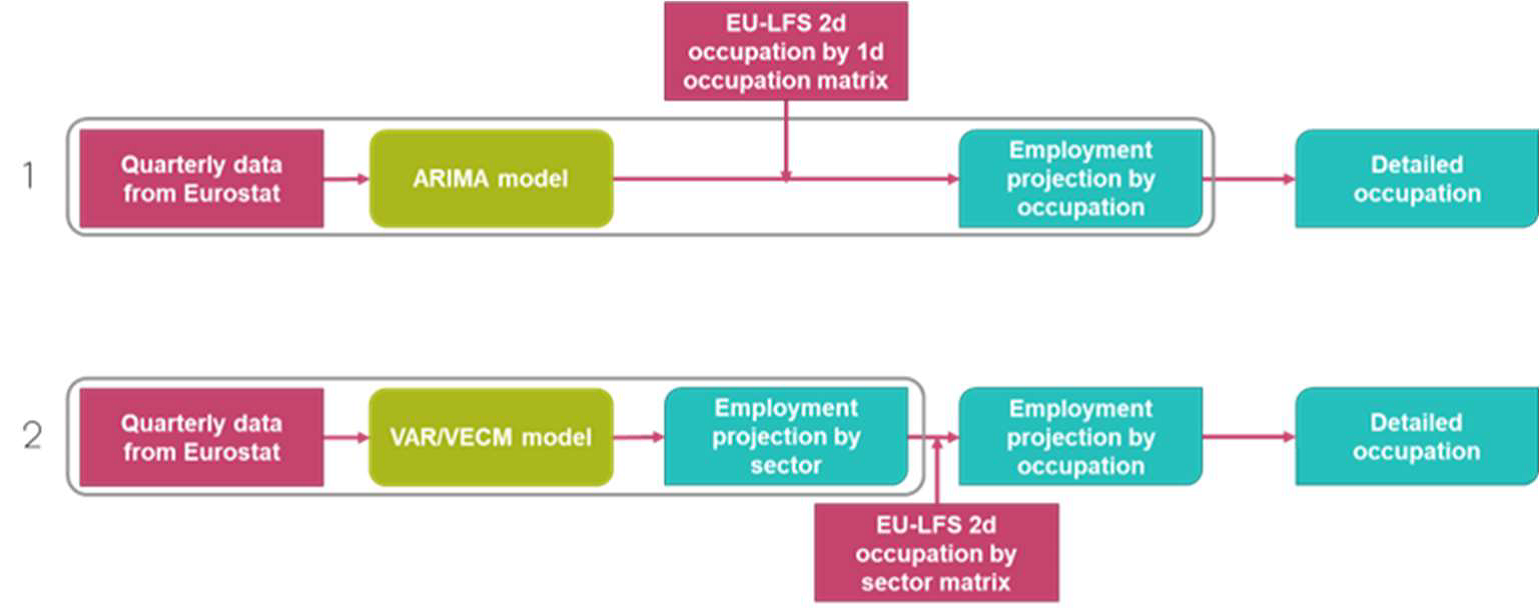 The conversion from sectoral results to occupations involves sector-by-2-digit occupation shares derived from an average of the last available periods of Eurostat annual data, similarly to the ARIMA case. This approach follows a procedure similar to the one used in the Cedefop Skills Forecast to link macroeconomic forecasts (disaggregated at sectoral level) to occupation and qualification outcomes.