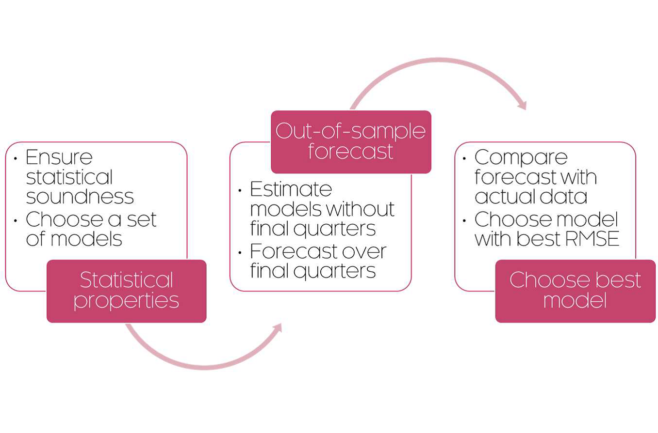 From the set of statistically sound models, those with superior out-of-sample forecast performance are preferred as the ‘best’ models. This performance is gauged by comparing forecast and outturn values for the most recent quarters in the data. The models are estimated on samples that exclude these quarters, and the prediction of the models evaluated according to root-mean-squared error (RMSE) over the chosen period. Both ARIMA and VAR/VECM models are subjected to this test to determine the best model from each part of the approach. Figure 2 summarises the model selection process, with more details provided in Section 4.