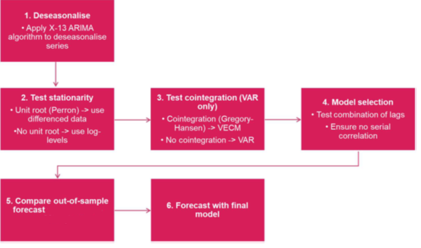 The model selection procedure (to identify the ‘best’ model) takes the premise that a ‘good’ model should not violate important statistical or economic assumptions. Based on a number of viable models, the best-performing one is then chosen. To this end, a procedure (for both the ARIMA and VAR/VECM models) that applies a series of tests for statistical reliability and soundness was developed.