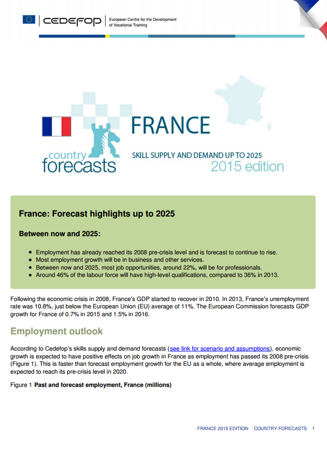 Source: Cedefop skills forecasts (2015)In 2013, in France, 9.7% of young people left the education and training system with low-level qualifications, close to the national target to reduce this to 9.5% by 2020. In the EU, the average in 2013 was 11.9%, still above its benchmark of less than 10% of young people leaving the education and training system with low-level qualifications by 2020.