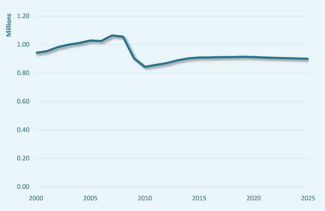 - Employment is forecast to increase slightly, but remain below its 2008 pre-crisis level.