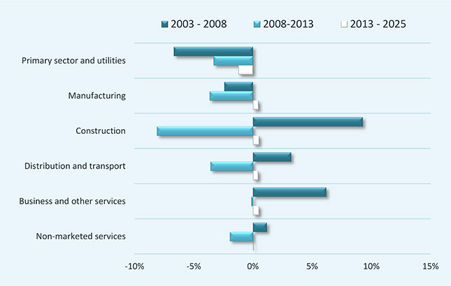 The economic crisis reduced employment in all sectors, notably construction and manufacturing between 2008 and 2013 (Figure 2). Future employment growth in Latvia up to 2025 will be in manufacturing, construction, distribution and transport, and business and other services. Employment in the primary sector is forecast to continue to fall but at a slower rate.