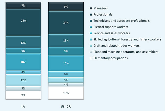 In Latvia, most job opportunities, around 28%, will be for professionals (high level occupations in science, engineering healthcare, business and teaching), followed by around 18% for service and sales workers (Figure 3). The proportion of job opportunities for craft and related trades workers, in Latvia around 12%, is significantly higher than the 5% forecast for the EU as a whole.