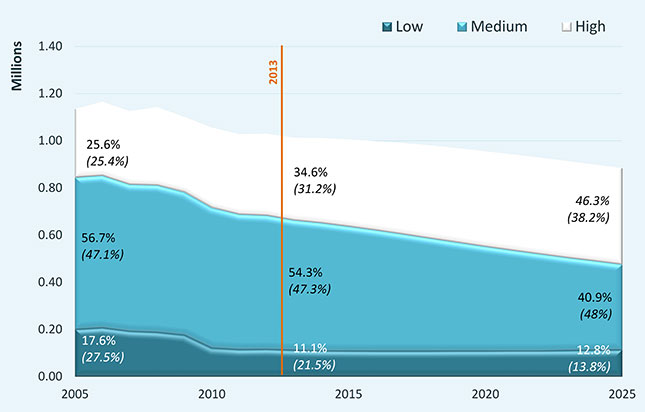 Although older and smaller, Latvia’s labour force is becoming more highly qualified (Figure 6). This is explained by older less-qualified people leaving and younger more highly-educated people entering the labour market. By 2025, the share of Latvia’s labour force with high-level qualifications should rise to 46.3% compared to 34.6% in 2013 and 25.6% in 2005. People with medium-level qualifications in 2025 will account for 40.9% of the labour force compared to 54.3% in 2013. Contrary to the general EU trend, in Latvia the share of the labour force with low-level or no qualifications is forecast to rise from 11.1% in 2013 to 12.8% in 2025.