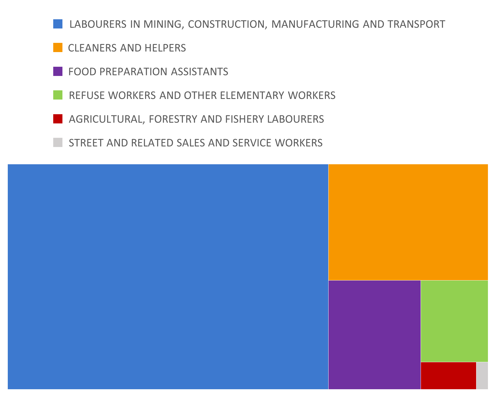 About a third of workers in elementary occupations (29 per cent) are engaged as labourers in mining, construction, manufacturing and transport. These workers perform simple and routine manual tasks in mining, quarrying, civil engineering, building, manufacturing, transport and storage operations.