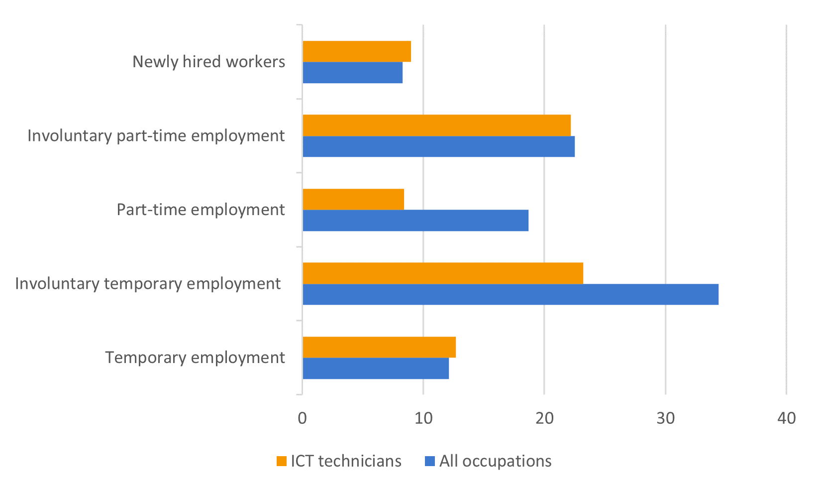 The share of ICT technicians that are employed via temporary contracts does not differ from that across all occupations, while part-time employment is a rare contract type for ICT technicians.