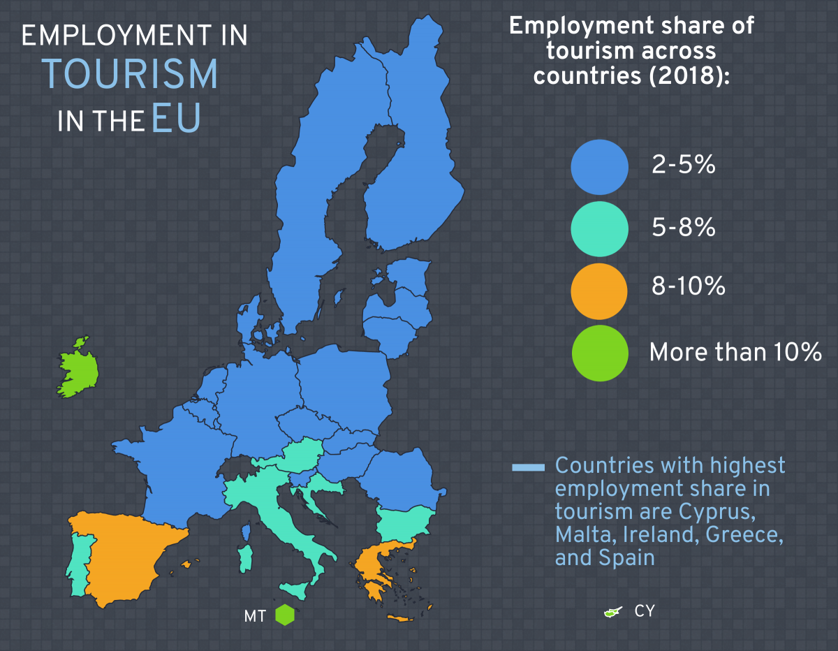The estimated share of tourism employment in the EU is about 5%; with Cyprus, Malta, Ireland, Greece and Spain displaying the highest employment shares (see Figure 2).