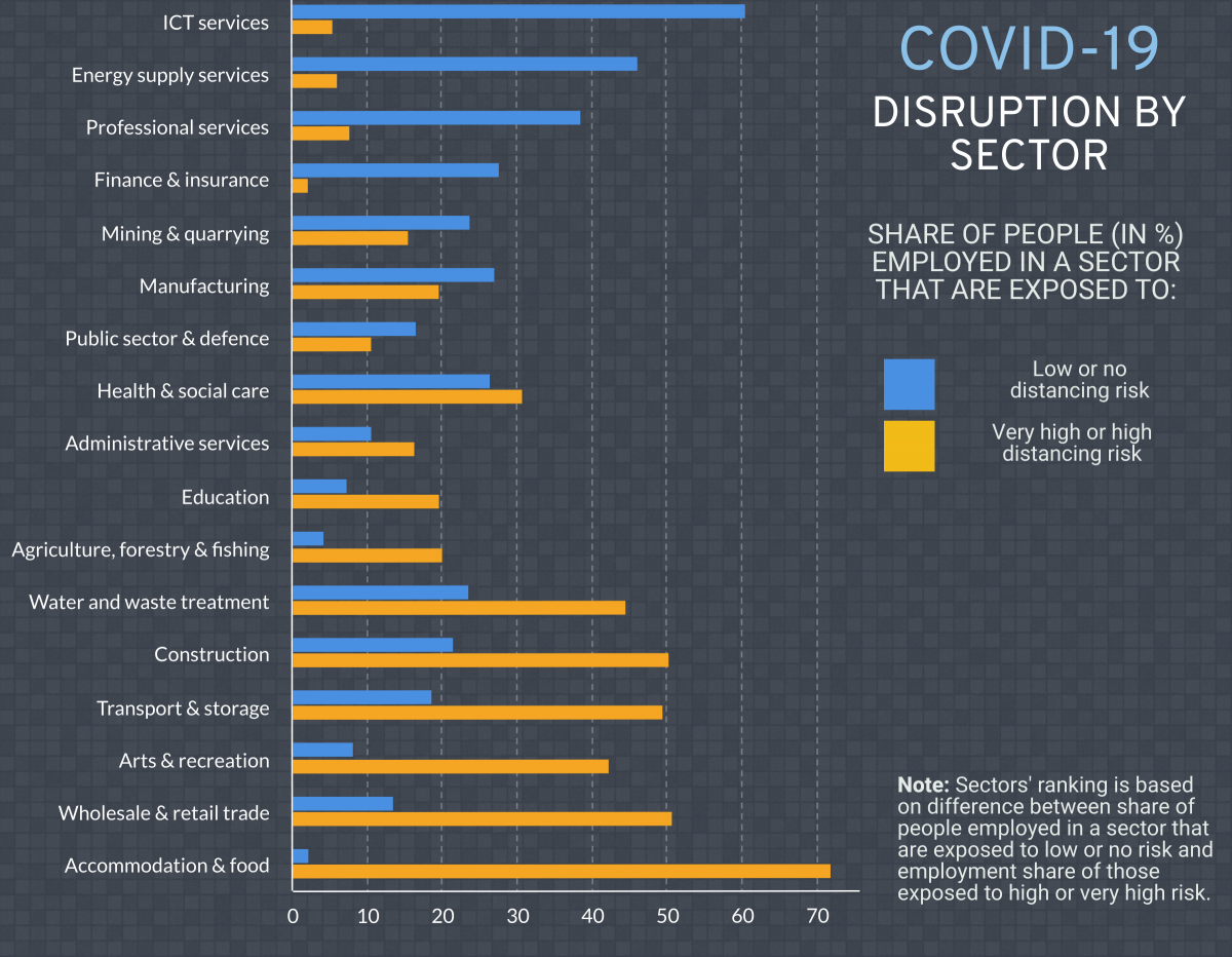 Employing a high share of people exposed to high social distancing risk increases the chances that key business or organisational activities may be severely disrupted. For example, while an accounting clerk in a restaurant has a very low exposure risk as compared to a waiter, disruption of the main activity of the restaurant represents a danger for both employees, who may experience reduced pay or even be laid off if the establishment shuts down.