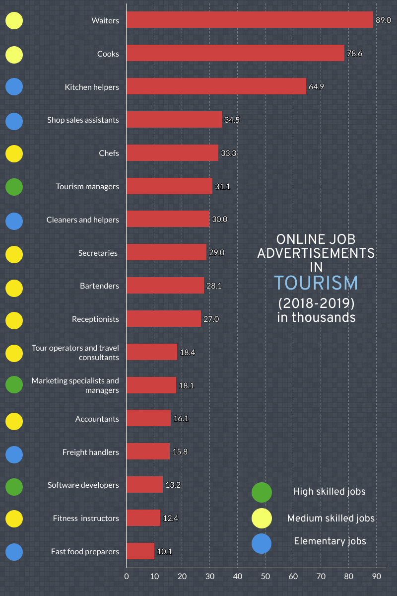 The Cedefop’s Skills OVATE database records 17 tourism occupations with more than 10 thousand job ads captured between July 2018 and December 2019. Most of these occupations are related to catering and food service, such as waiters, cooks, chefs or bartenders. Medium skilled and elementary occupations are mostly offered while job ads for high skilled occupations, such as managers, software developers or marketing specialists also appear in the top list (see Figure 5).