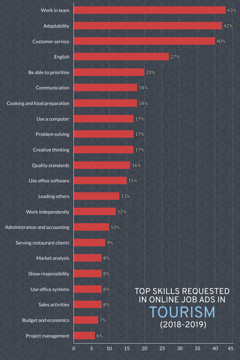 It is important to note though that job-specific technical skills may not be explicitly mentioned in many tourism job ads. Simple “bartender needed. Experience welcome” may be sufficient for attracting candidates. High level jobs tend to have more detailed vacancy notices as well as those advertised by large enterprises and multinational companies. However, significant part of tourism jobs regards employment in micro-sized establishments (less than 10 employees) whose job ads tend to be shorter and less descriptive[9].