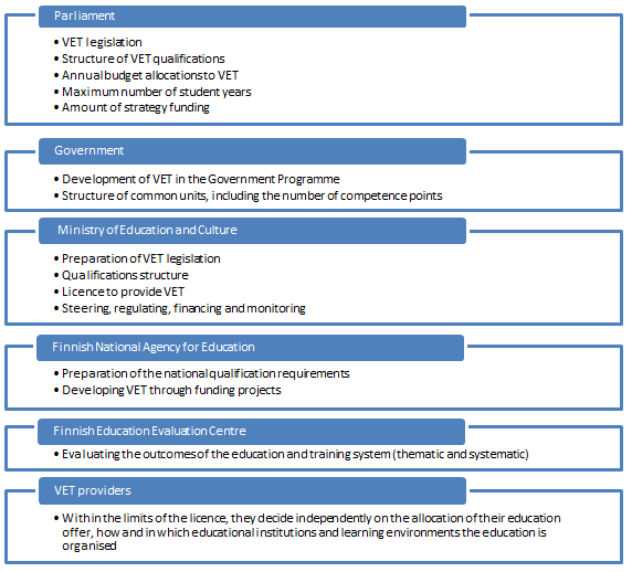 The legislation on VET gives education providers a great deal of freedom in deciding on the measures concerning their education provision, use of public funding and quality management. The legislation obliges the providers to evaluate their training provision and its effectiveness as well as to participate in external evaluations. This means that the education providers need to have their own operating system that contains relevant and functional quality management measures (selected by VET providers).