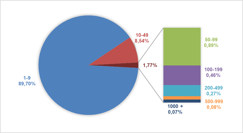 In 2020, most companies are micro companies with fewer than 10 employees (89.7%), see figure below. Adding in companies without employees, 99.2% of businesses have fewer than 50 employees or none.