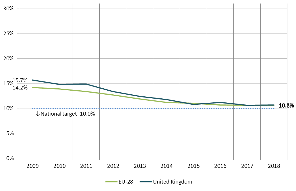 The share of early leavers from education and training has dropped by 5 percentage points from 15.7% in 2009 to 10.7% in 2018, close to the national target set for 2020 (10%) and close to the EU average share (10.6%) in 2018.