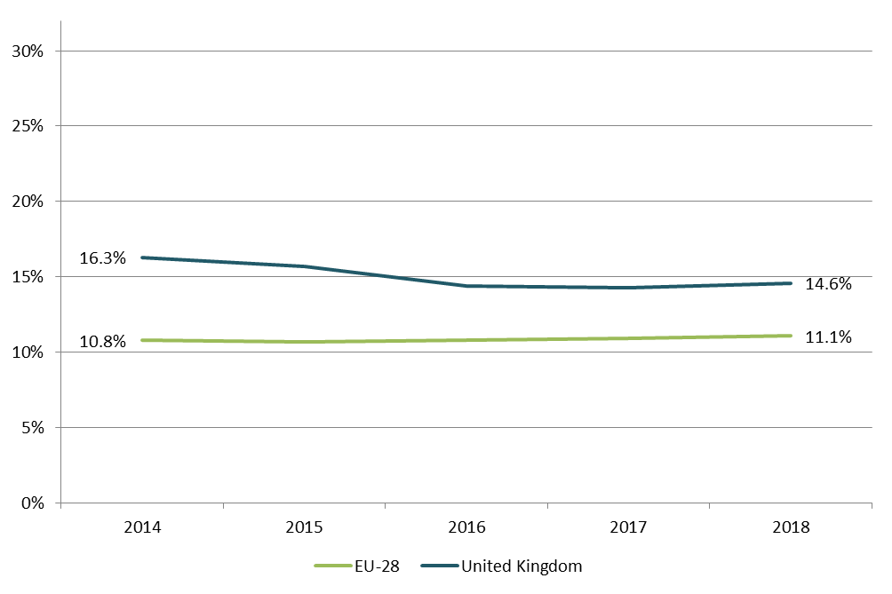 In 2018, the share of population aged up to 64 with higher education in the UK was the sixth highest in the EU28+(43.1%) and well above the EU average (32.2%)in the same group. The share of those with low level qualifications (19.6%) is below the EU average (21.8%) while middle-level qualifications is rather low (37.1%) compared to the EU average (45.7%) and the seventh lowest in the EU, following Spain, Portugal, Malta, Luxembourg, Iceland and Ireland.