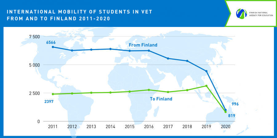 The COVID-19 pandemic has also affected international mobility of VET learners, which decreased by 78% (outgoing) and 75% (incoming) in 2020 compared to 2019.