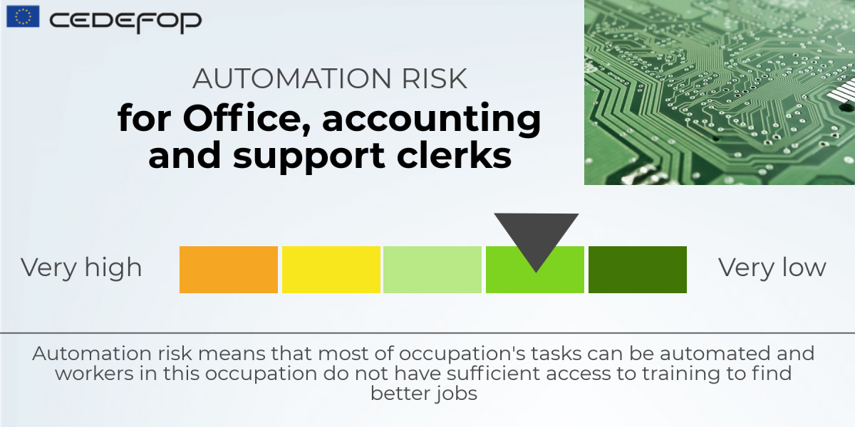 - Risk of automation: As a part of its Digitalisation and future of work project, Cedefop estimates the risks of automation for occupations. The most exposed occupations are those with significant share of tasks that can be automated – operation of specialised technical equipment, routine or non-autonomous tasks – and those with a small reliance on communication, collaboration, critical thinking and customer-serving skills. The risk of automation is further accentuated in occupations where employees report little access to professional training that could help them to cope with labour market changes. Office, accounting and support clerks belong to occupations where the automation risk is lower.